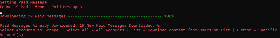 However, when performing a full profile download, it consistently fails to include images within paid message bundles. Audio and video files are downloaded successfully, but the images are missing. The log reports that it found 19 paid messages and downloaded them, even though the images were not actually retrieved.